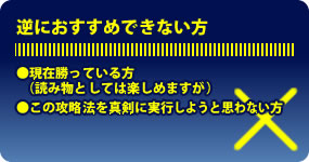 もし、これらの約束を守る事が出来ないのであれば、今すぐこのページを閉じてください。 約束を守れない人に攻略法を提供するつもりはありませんので、約束を守れるという人だけ読み進めてください。